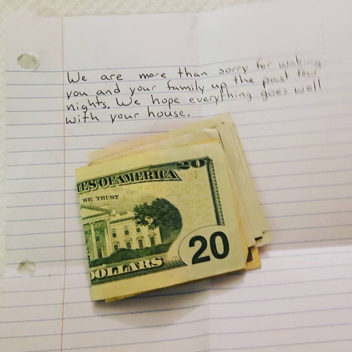 Around 20 minutes later, Randi discovered a heartwarming note on her hotel room floor. Inside the note, it read, “We’re sorry about your home. We wanted to give you something maybe that could help you,” accompanied by $40 in cash.