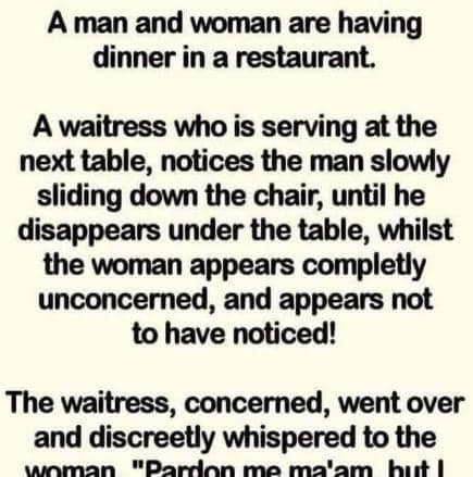 A gentleman and a lady were dining at a fancy restaurant when the waitress noticed something odd. The man gradually sank down his seat, disappearing beneath the…