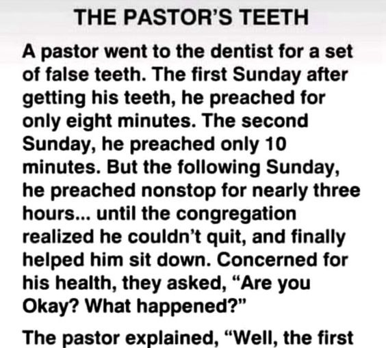 THE PASTOR’S TEETH A pastor went to the dentist for a set of false teeth. The first Sunday after getting his teeth, he preached for only eight…