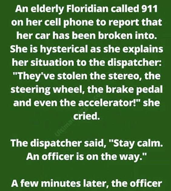 An elderly Floridian called 911 on her cell phone to report that her car has been broken into. She is hysterical as she explains her situation to…