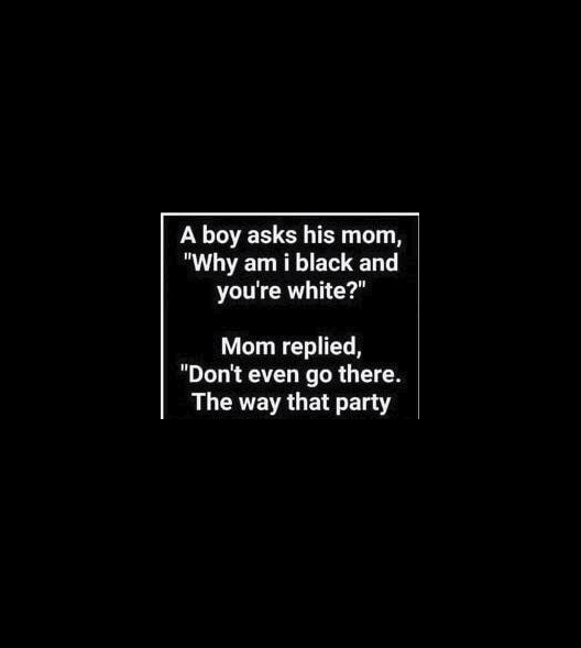 A boy asks his mom, “Why am I black and you’re white?” Mom replied, “Don’t even go there. The way that party went, you’re lucky you don’t…