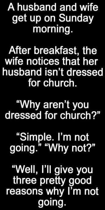 A husband and wife get up on Sunday morning. After breakfast, the wife notices that her husband isn’t dressed for church. “Why aren’t you dressed for church?”…