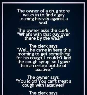 The owner of a drug store walks in to find a guy leaning heavily against a wall. The owner asks the clerk, “What’s with that guy over…